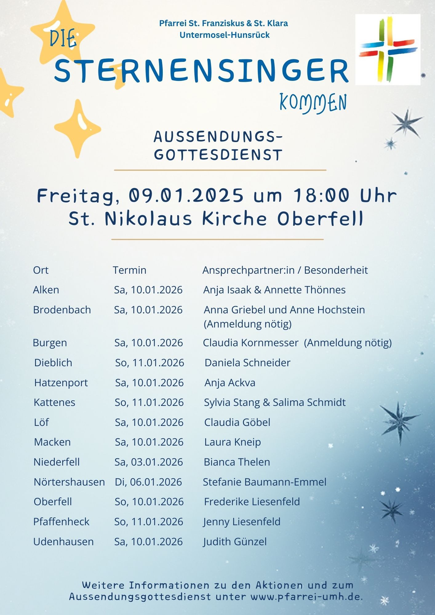 Könige und Sternträger ziehen in Gruppen mit Segensspruch, Liedern und Weihrauch von Haus zu Haus, schreiben den Segen „20C+M+B+26“ (“Christus mansionem benedicat - Christus segne dieses Haus”) mit Kreide an die Haustür oder übergeben einen Aufkleber mit dem Segen anzubringen. Wir würden uns sehr freuen, wenn Sie die Kinder freundlich empfangen und die Aktion mit Ihrer Spende unterstützen. Gerne dürfen Sie das Engagement der Sternsinger auch mit einer kleinen Süßigkeitenspende belohnen.